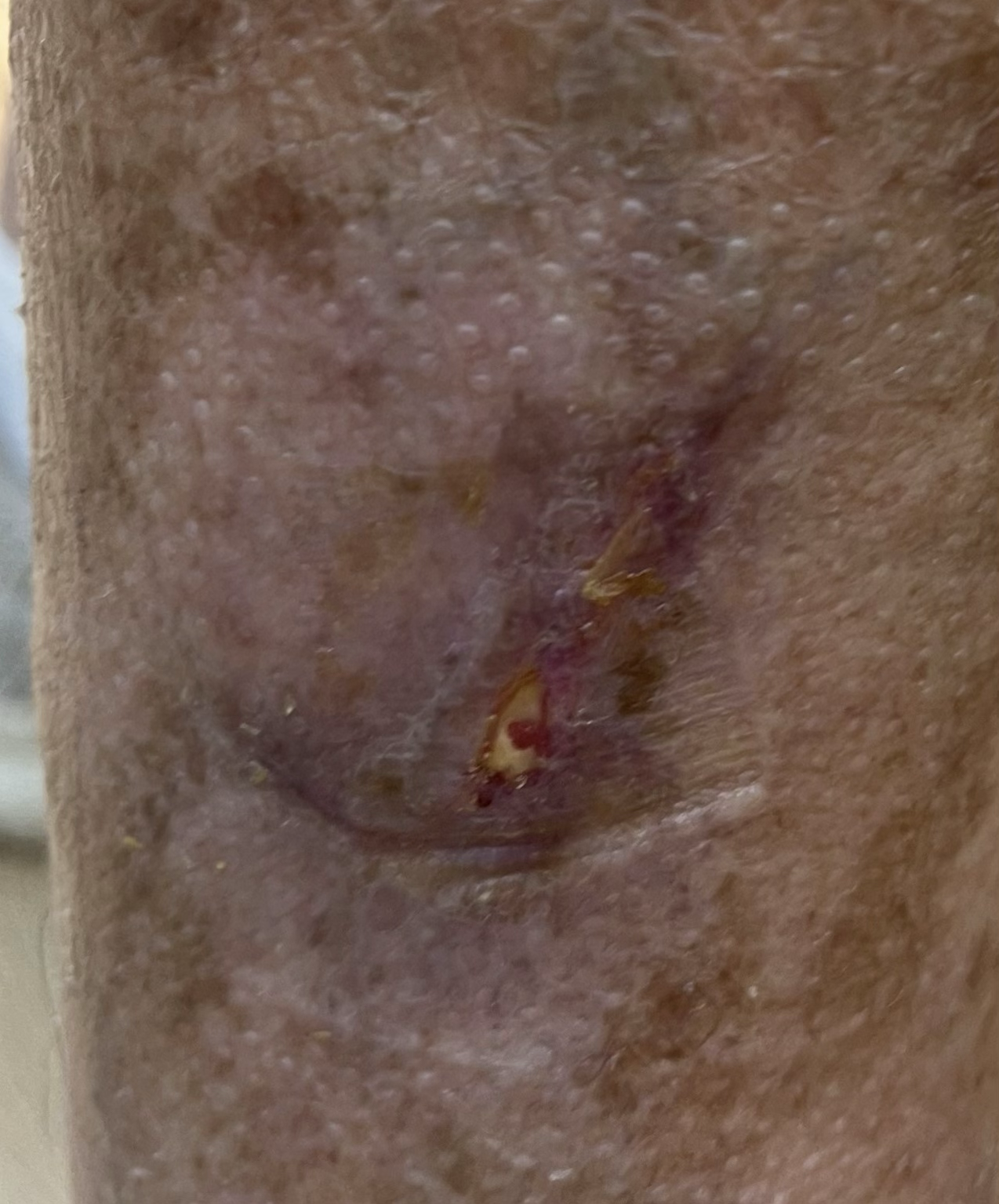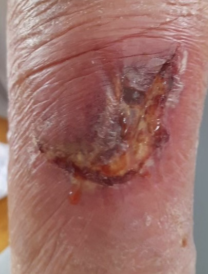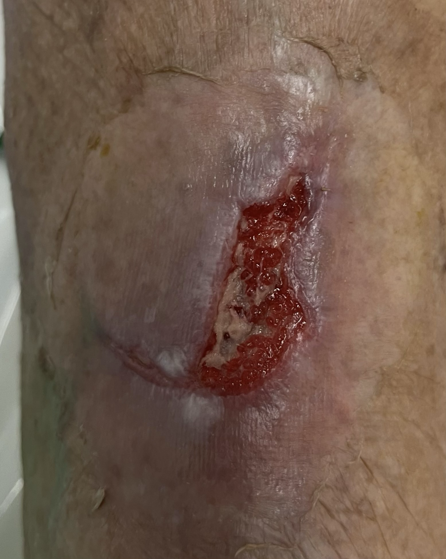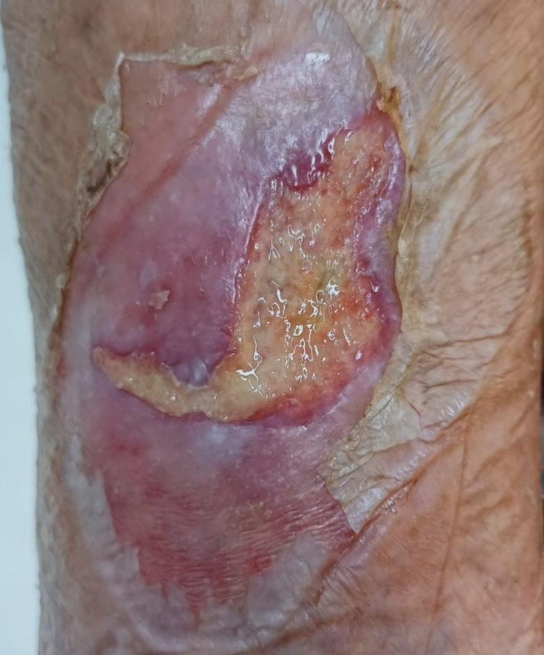 A patient presented with an infected type 3 skin tear. Type 3 tears are characterised by complete loss of the skin flap, making them particularly challenging to treat. The wound showed clear signs of infection with surrounding redness, exudate, and biofilm formation.